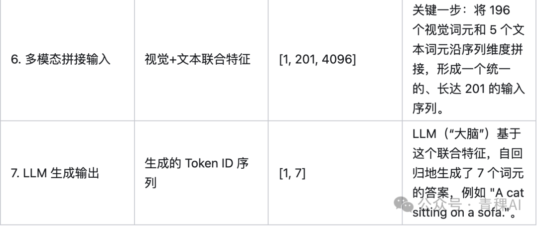 正如表格第 6 步所示,最终送入 LLM 的,是一个全新的、更长的序列。在这个例子中,序列的总长度变成了 196 + 5 = 201。这个序列的前 196 个位置,承载着图像的全部视觉信息;而紧随其后的 5 个位置,则明确了用户的意图和问题。LLM 的自注意力机制将在这个统一的序列上运作,使得文本词元可以“关注”到视觉词元,反之亦然,从而实现了真正意义上的图文理解。