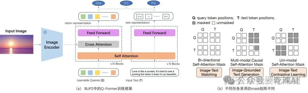与 LLaVA 的极简主义形成鲜明对比的是以 BLIP-2 模型为代表的精巧设计——Q-Former。它认为,“翻译官”不应该只是一个被动的“传声筒”,而应该是一个能够主动思考、提炼关键信息的“专家”。