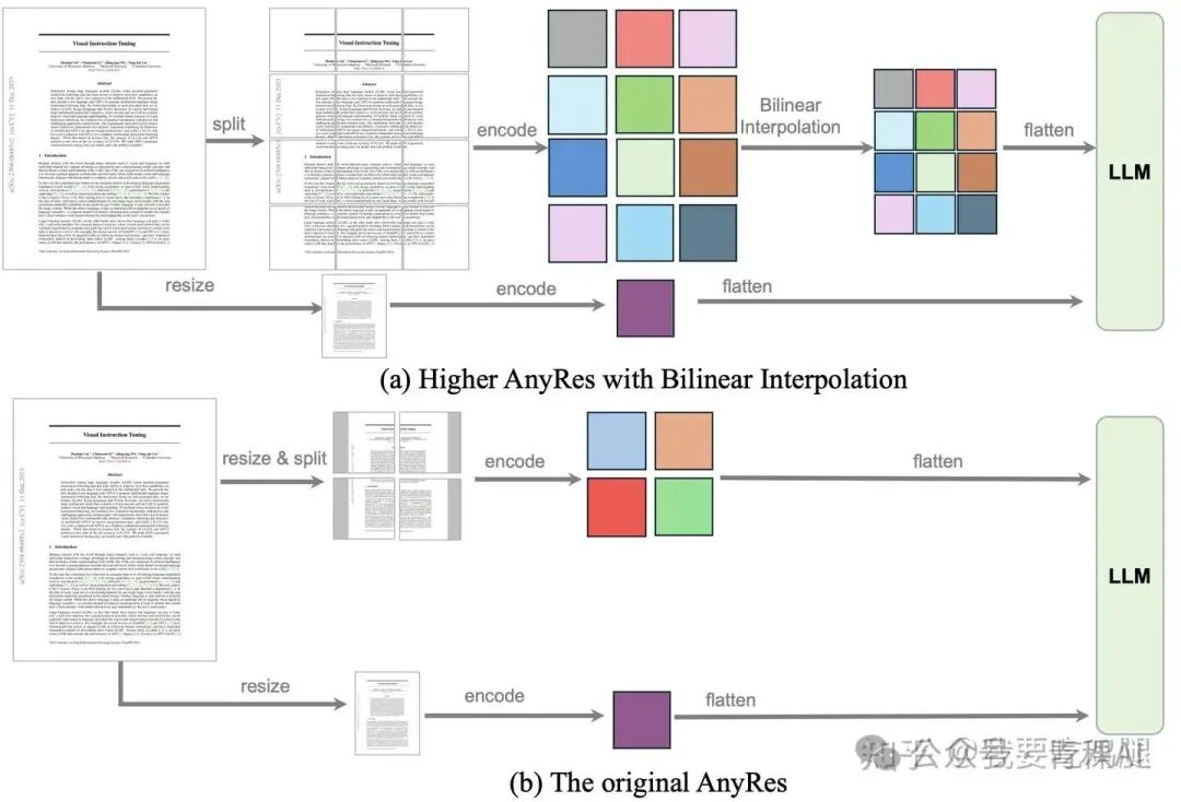 这一思想在后续的 LLaVA-OneVision 中进一步演进为 Higher AnyRes,通过引入双线性插值来更好地融合图块特征,以应对文档理解等对空间布局要求极高的任务。
