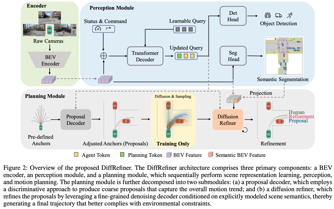 所提出的DiffRefiner框架整合了三个关键组件:感知模块、proposal解码器和基于扩散的细化器,构建了统一的粗到细轨迹规划架构。如图2所示,该框架包含三个主要部分:(1)以BEV为中心的感知模块,处理传感器输入并通过辅助任务训练以增强场景理解;(2)粗轨迹proposal解码器,采用轻量级Transformer,通过调整锚点生成初始路径预测;(3)基于扩散的轨迹细化器,通过迭代去噪和细化proposal,生成能更好捕捉真实驾驶复杂性的优化轨迹。
