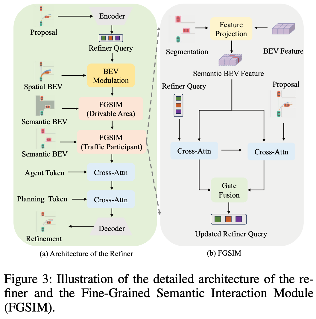 该架构首先通过空间BEV调制模块从BEV表示中提取轨迹条件空间特征,这些特征初始化细粒度语义交互模块(FGSIM),该模块通过两个连续的细化阶段工作。