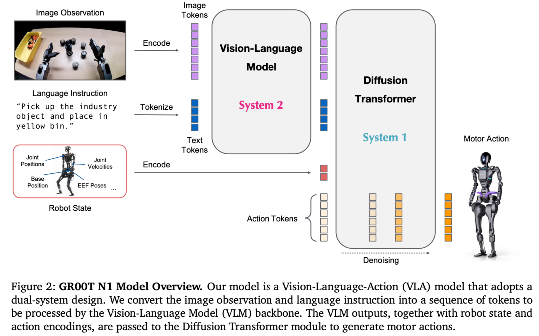 提出双系统VLA架构:将视觉语言模型(Eagle-2 VLM)作为慢速推理模块(System 2)处理环境理解,与基于扩散Transformer(DiT)的快速动作生成模块(System 1)紧密耦合、端到端联合训练,实现了语义理解与实时动作输出的高效协同。