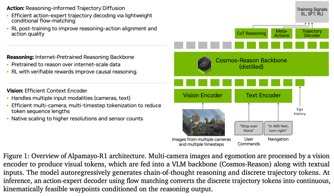 设计了 模块化推理VLA架构,以物理AI预训练的Cosmos-Reason为骨干,结合基于流匹配的轨迹解码器,实现高效的多相机时序感知与实时轨迹生成,在保证推理深度的同时满足车载部署的实时性要求(99ms延迟)。