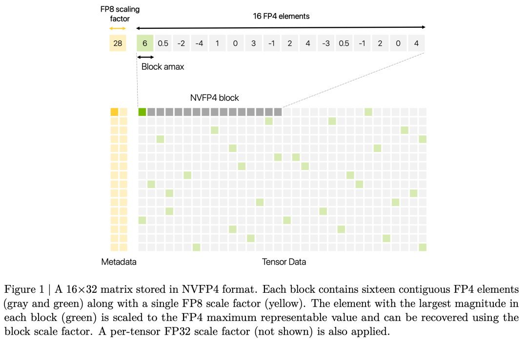 提出 NVFP4 格式:一种增强型 4 位微缩放格式,通过将块大小从 32 减小到 16、使用 E4M3 格式存储块尺度因子、并引入张量级 FP32 尺度进行两级缩放,显著提升了数值表示的准确性,尤其是对异常值的捕获能力,减少了小值量化为零的损失。
