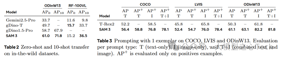 SAM3在不同数据集上的表现: 无论是在LVIS、COCO还是OdinW13上,SAM3都展现了优越的性能,特别是在零-shot学习和多模态输入(文本和图像结合)上,能够在没有大量标注数据的情况下进行有效的物体分割。