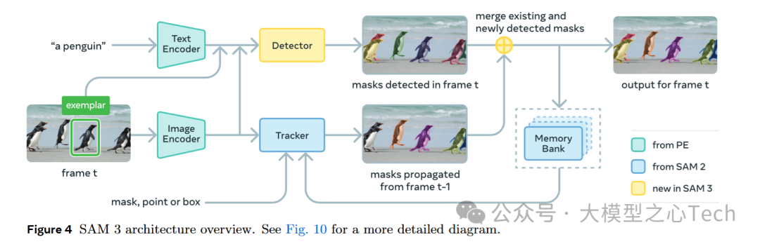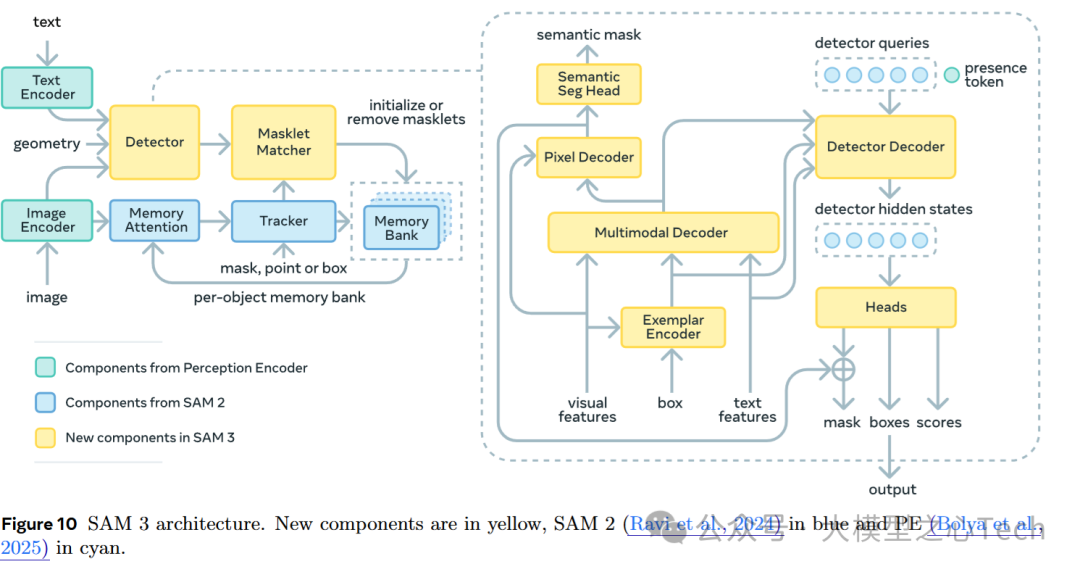 值得注意的是,在SAM3中,检测器和记忆库的工作原理从SAM2中继承,并经过进一步的优化和增强,以提升对复杂场景的适应能力。