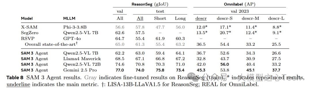 RefCOCO和RefCOCOg数据集上的结果: SAM3 Agent在这些基准数据集上表现也很优秀,超越了之前的零-shot模型,说明了这种多模态(文本和视觉)结合的方式对复杂任务的解决能力。