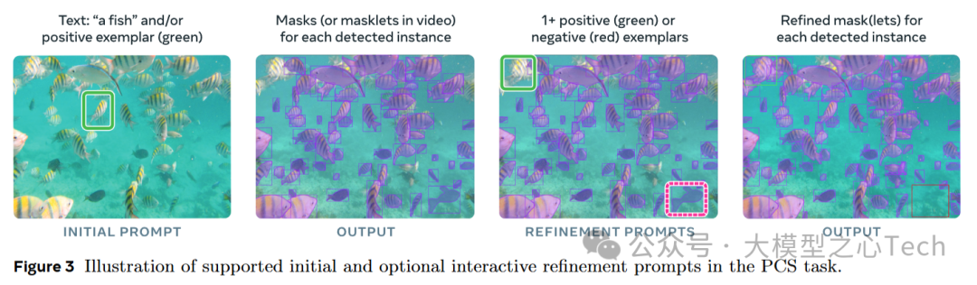 在Promptable Concept Segmentation (PCS) 任务中,通过正面示例(绿色框)和负面示例(红色框),SAM3能够根据用户反馈调整分割结果,使其更加精确。