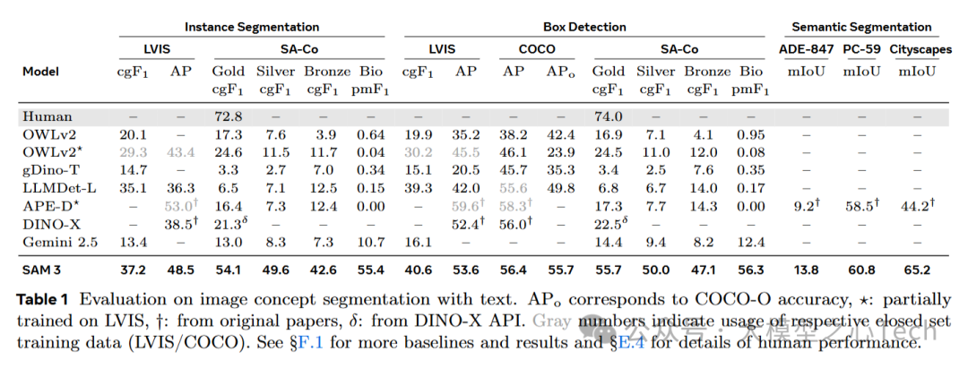 SAM3的结果在各项图像概念分割任务中表现突出,具体表现为: