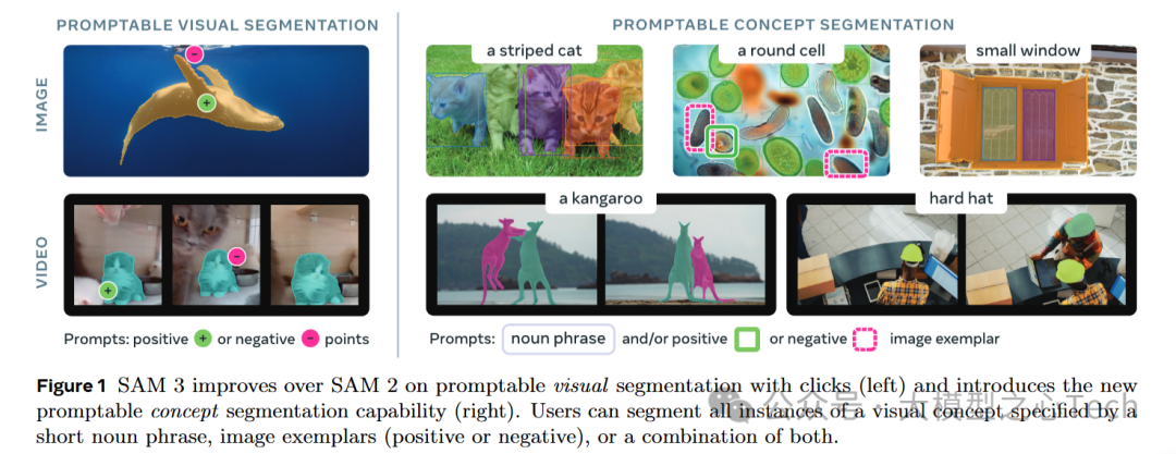 Meta在AI领域的持续创新,特别是在视觉模型方面,已经取得了巨大的突破。从2023年发布的SAM1开始,Meta就开始了对“可提示图像分割”(Promptable Visual Segmentation, PVS)的探索,推出了一个可以通过简单的图像框选、点击或语义提示来完成图像分割的革命性模型。这一开创性工作迅速吸引了业界的关注,标志着计算机视觉技术进入了一个新的时代。更多大模型前沿进展,欢迎加入『大模型之心tech知识星球』
