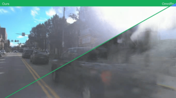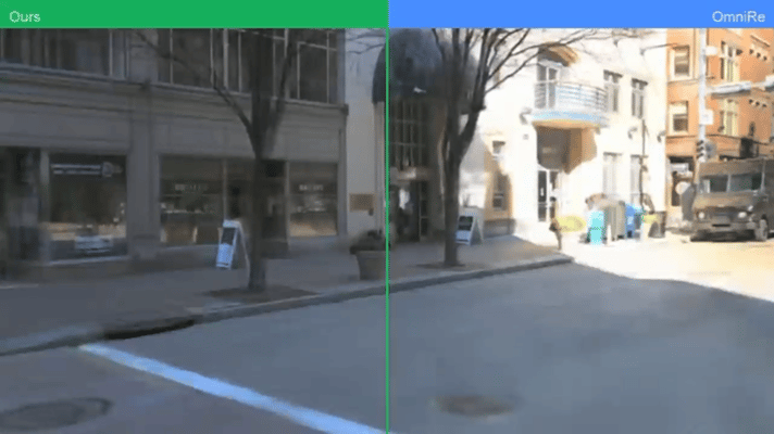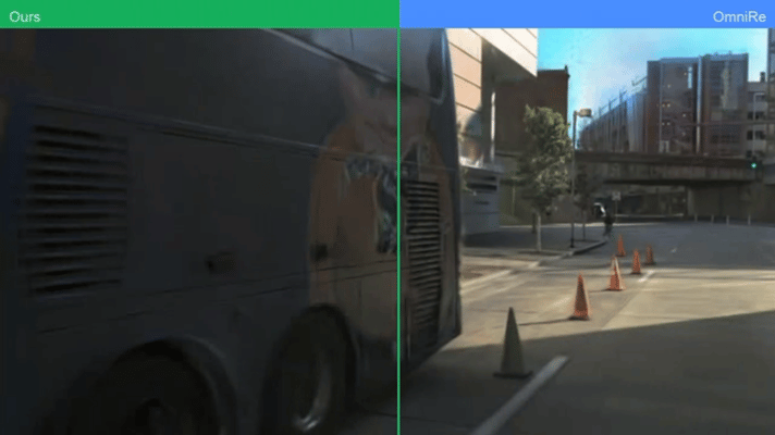 与 OmniRe 对比,视频中可以看到我们的方法在反射区域的处理上更加精准,避免了反射物体的畸变和浮动现象。