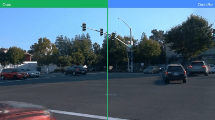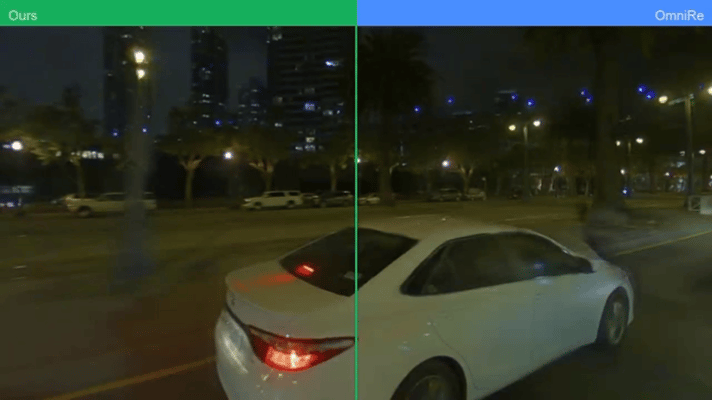 另一个视频展示了 我们的多尺度双边格栅 与 OmniRe 方法在阴影和阳光变化下的对比。
