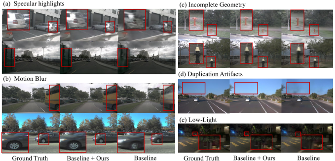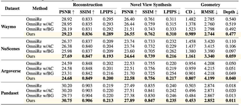 通过在多个标准数据集(如Waymo、NuScenes、Argoverse和PandaSet)上的实验验证,该方法在几何精度和视觉质量上均超越了现有技术,尤其在复杂的动态场景中表现优异。