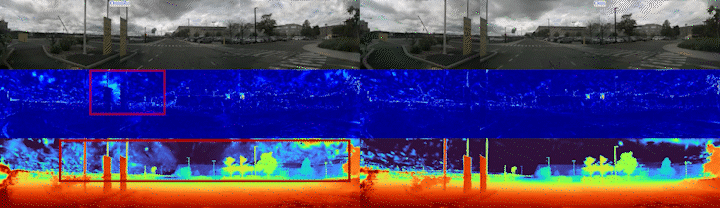 左:本文的方法,右:OmniRe,极端光照变化导致OmniRe出现严重的光度不一致和几何失真。我们的方法则有效解决了光照变化带来的问题,呈现出更加清晰、稳定的几何结构。