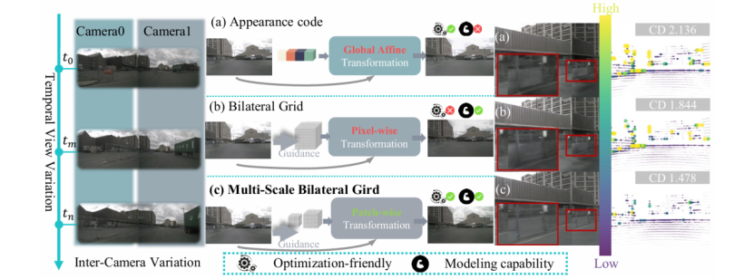 为此,北京智源人工智能研究院(BAAI), 清华大学智能产业研究院(AIR) 提出了一种多尺度双边网格框架,能够在不同尺度上对3D场景表征进行局部和全局调整,从而有效解决了光度不一致性问题,并提升了几何重建的精度。
