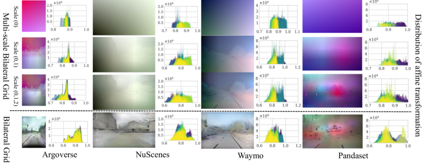 1.下排(Bilateral Grid):代表传统的单尺度双边网格。可以观察到,其学习到的变换分布通常呈现出两个尖锐的峰值(即“双峰分布”)。这表明它只学会了少数几种固定的、缺乏弹性的校正模式,难以适应真实世界中多样化的光照变化。