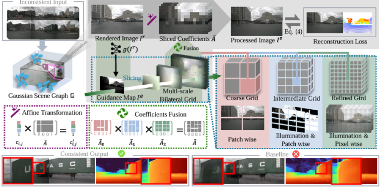 渲染图像接下来会送入我们设计的多尺度双边网格进行处理,最终输出色彩一致且观感真实的高质量图像。此过程分为三层次: