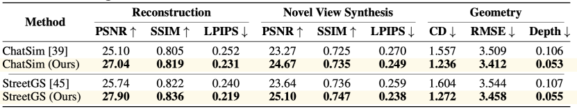 结果显示,本文的方法能作为即插即用的增强模块,带来巨大提升。例如,它将ChatSim的重建PSNR从25.10提升至27.04;同时将StreetGS的重建PSNR从25.74提升至27.90,并将其几何误差(CD)从1.604降低到1.272。