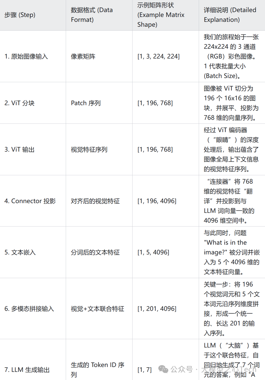 正如表格第 6 步所示,最终送入 LLM 的,是一个全新的、更长的序列。在这个例子中,序列的总长度变成了 196 + 5 = 201。这个序列的前 196 个位置,承载着图像的全部视觉信息;而紧随其后的 5 个位置,则明确了用户的意图和问题。LLM 的自注意力机制将在这个统一的序列上运作,使得文本词元可以“关注”到视觉词元,反之亦然,从而实现了真正意义上的图文理解。