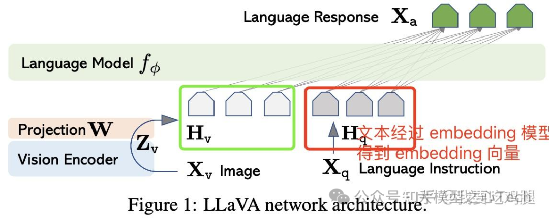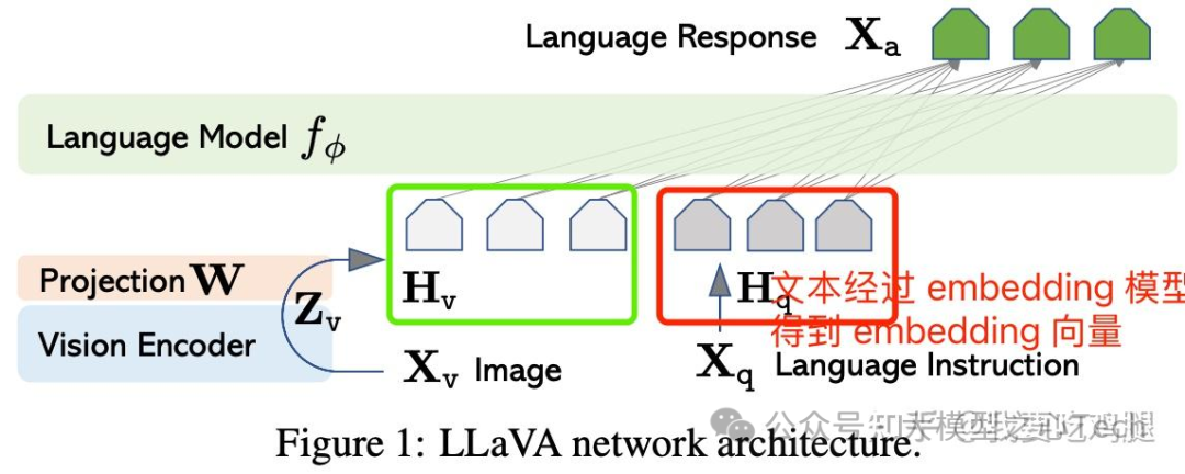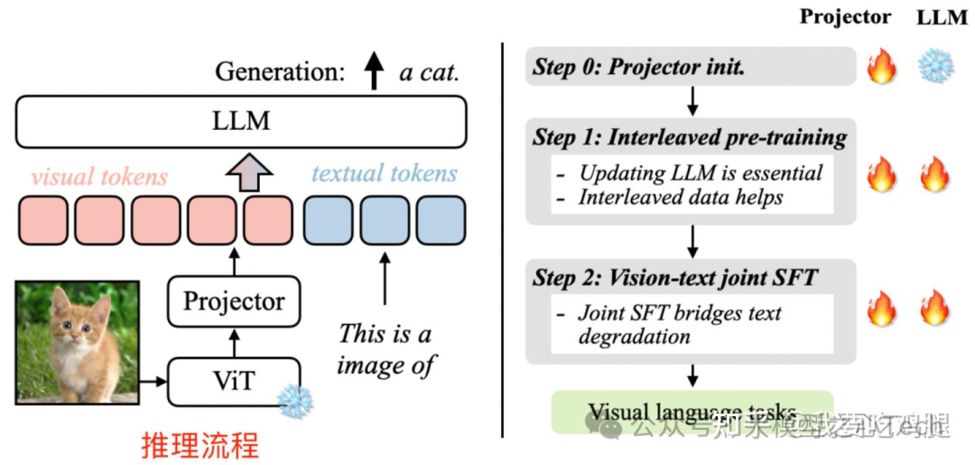 例如,当用户输入一张图片并提问“What is in the image?”时,LLM 的最终输入会是[觉词元1, ..., 视觉词元196, "What", "is", "in", "the", "image", "?"]样拼接后的形态。