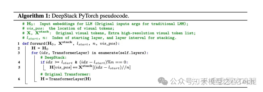 其伪代码显示,核心逻辑仅仅是在 Transformer 层的循环中,增加一个简单的条件判断和一次原地加法 (in-place addition) 。具体来说,就是找到当前层隐藏状态中属于视觉词元的部分,然后直接将待注入的额外视觉特征加到它们上面。这与 Qwen3-VL 源码中 _deepstack_process 函数的实现逻辑完全一致,计算开销极小。