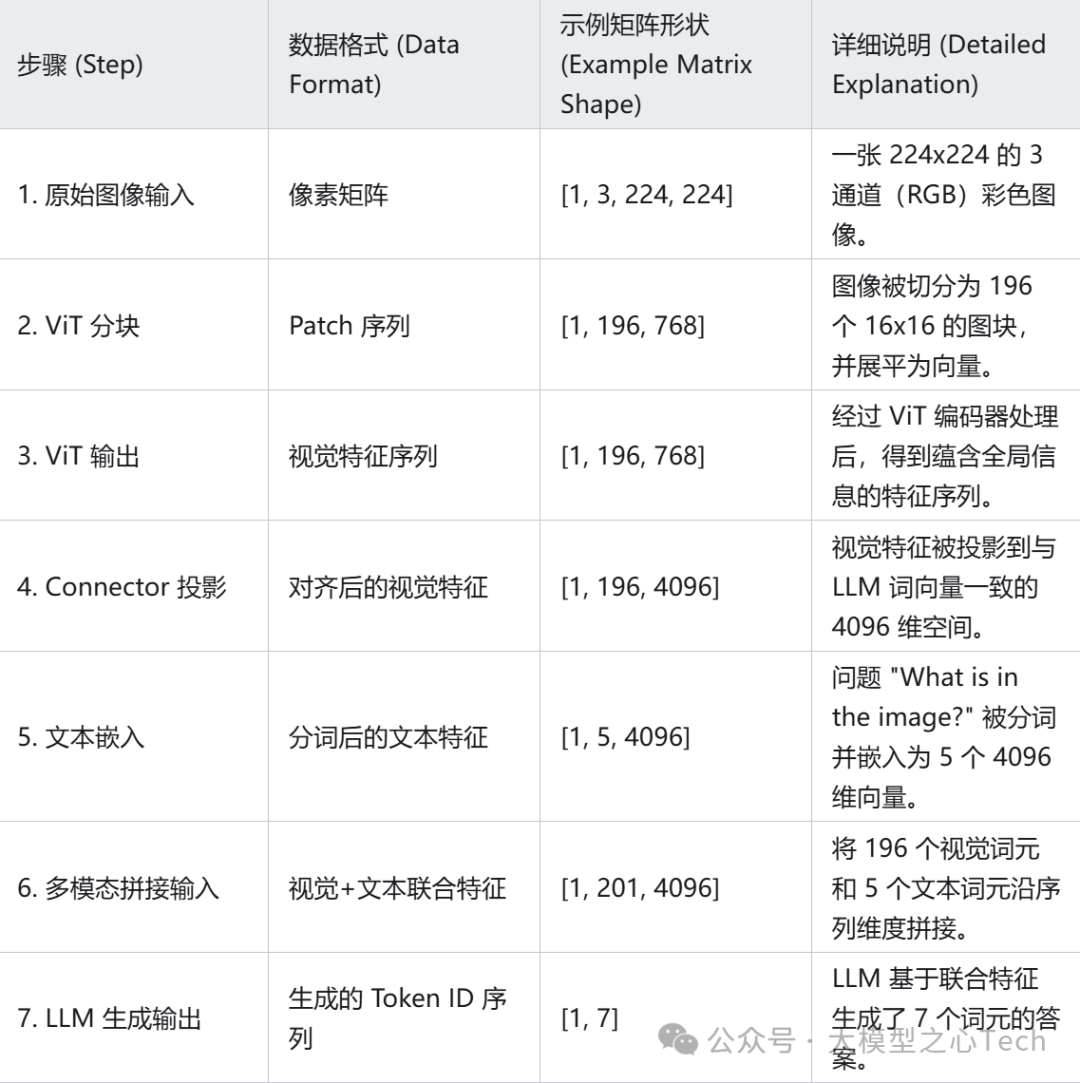 正如表格第 6 步所示,最终送入 LLM 的,是一个全新的、更长的序列。在这个例子中,序列的总长度变成了 196 + 5 = 201。这个序列的前 196 个位置,承载着图像的全部视觉信息;而紧随其后的 5 个位置,则明确了用户的意图和问题。LLM 的自注意力机制将在这个统一的序列上运作,使得文本词元可以“关注”到视觉词元,反之亦然,从而实现了真正意义上的图文理解。