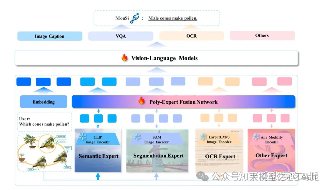 为了更好地理解 DeepStack 的独特性,我们可以将其与 MouSi 模型所代表的“多专家广度融合”路线进行对比。MouSi 采用多个并行的、专门的视觉编码器(如 CLIP, SAM)作为“专家”,分别提取不同维度的信息,然后通过一个复杂的“多专家融合网络”进行整合。如果说 MouSi 是在“广度”上做文章,那么 DeepStack 就是在“深度”上求突破,两条路线各有千秋。