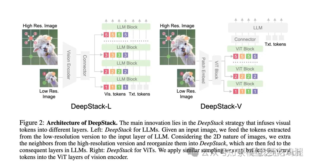 DeepStack-V (for ViTs): 这是将视觉信息注入到视觉编码器(ViT)自身的版本。整个注入过程都发生在 ViT 内部,旨在视觉编码阶段就构建一个多尺度的层次化视觉表征。