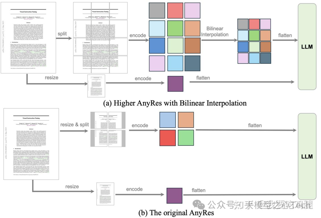 这一思想在后续的 LLaVA-OneVision 中进一步演进为 Higher AnyRes,通过引入双线性插值来更好地融合图块特征,以应对文档理解等对空间布局要求极高的任务。