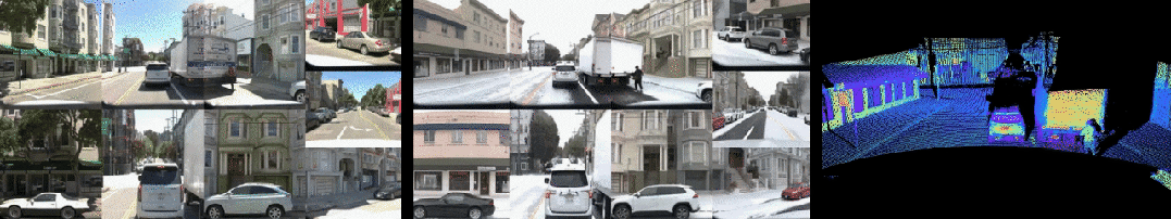 通过对全局场景元素(如天气条件和时间)使用文本提示,同时对场景中的动态元素(如其他道路使用者和交通信号灯)进行语义条件约束,我们能够将真实世界场景(左侧)转化为高度逼真的仿真场景(中间为摄像头仿真画面,右侧为激光雷达仿真画面)。值得注意的是,在该示例中,传感器数据完全是合成的,由我们的生成式传感器仿真模型基于底层紧凑的结构化世界表示生成。