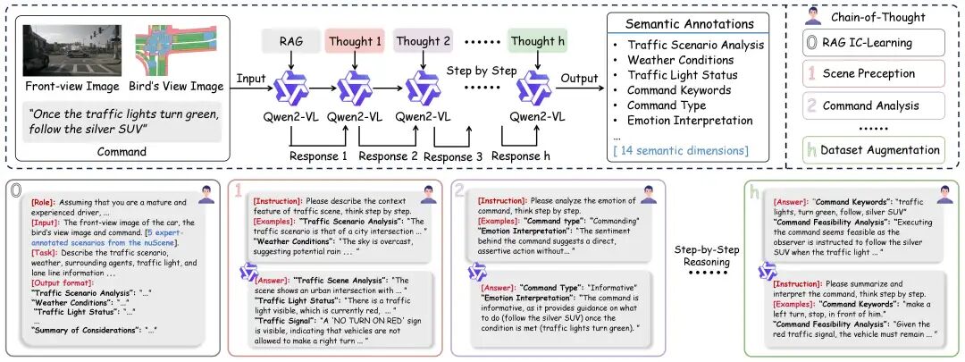 除了模型创新,该团队还发布了DrivePilot数据集。在自动驾驶领域,数据就是燃料。但传统的公开数据集往往面临“营养不良”的窘境:场景单一、标注只有冷冰冰的物体框,缺乏深层的语意理解。为了给AI提供最优质的“教材”,团队利用Qwen2-VL大模型的强大场景理解能力,配合RAG(检索增强生成)和CoT(思维链)技术,构建了一套自动化的高质量数据生产流水线,发布了DrivePilot数据集。