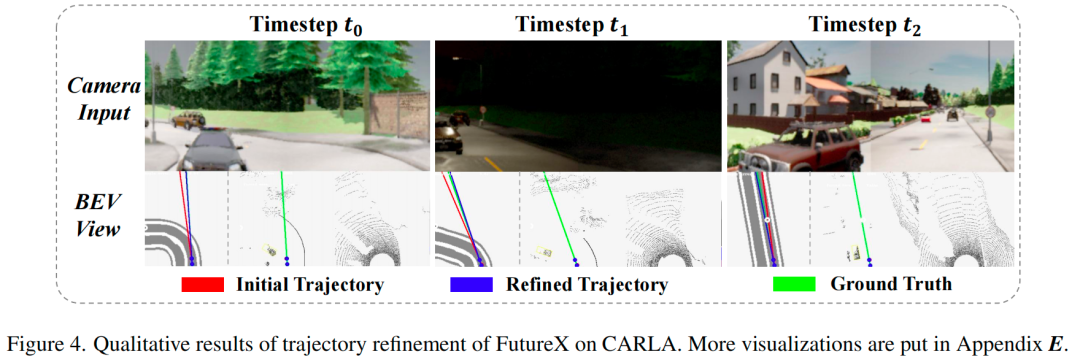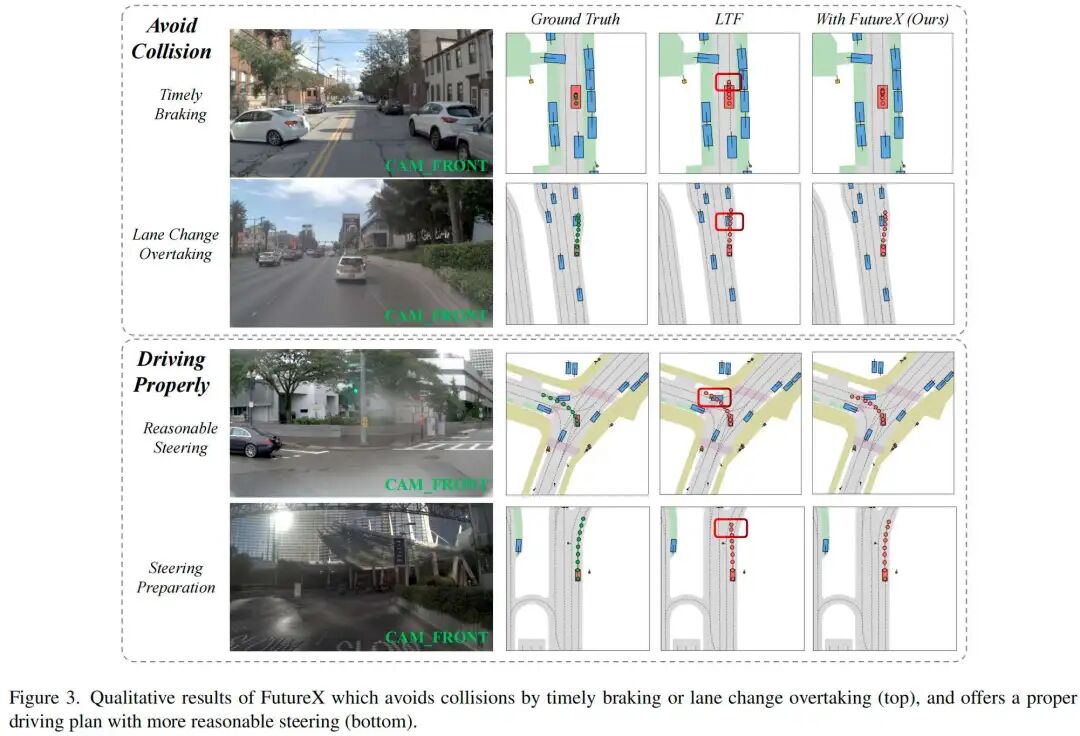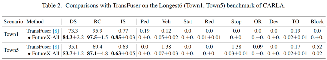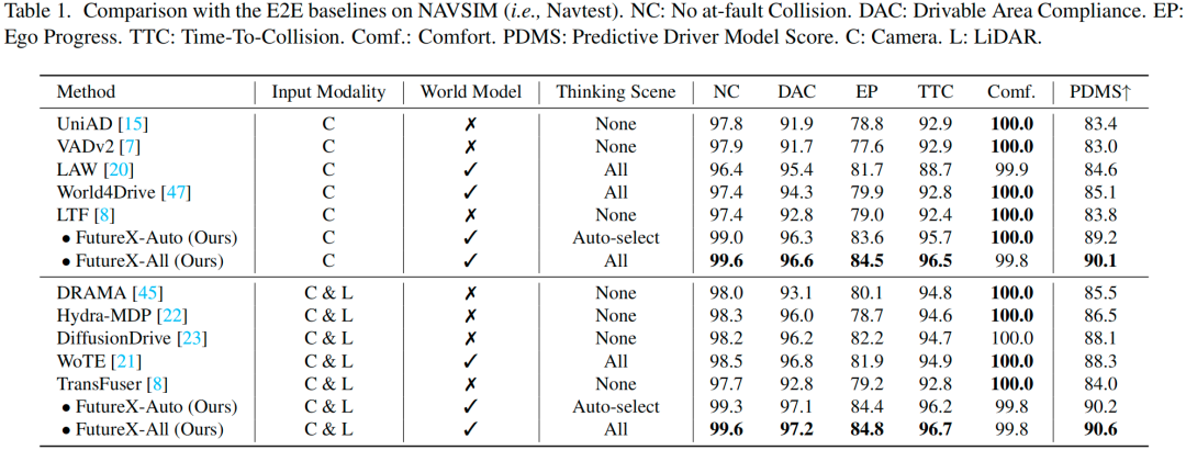 3)实证层面:即使基于传统骨干网络(如LTF和TransFuser),FutureX在纯视觉和视觉-激光雷达(camera-LiDAR)两种设置下均达到当前最优性能,验证了所提方法的有效性与广泛适用性。