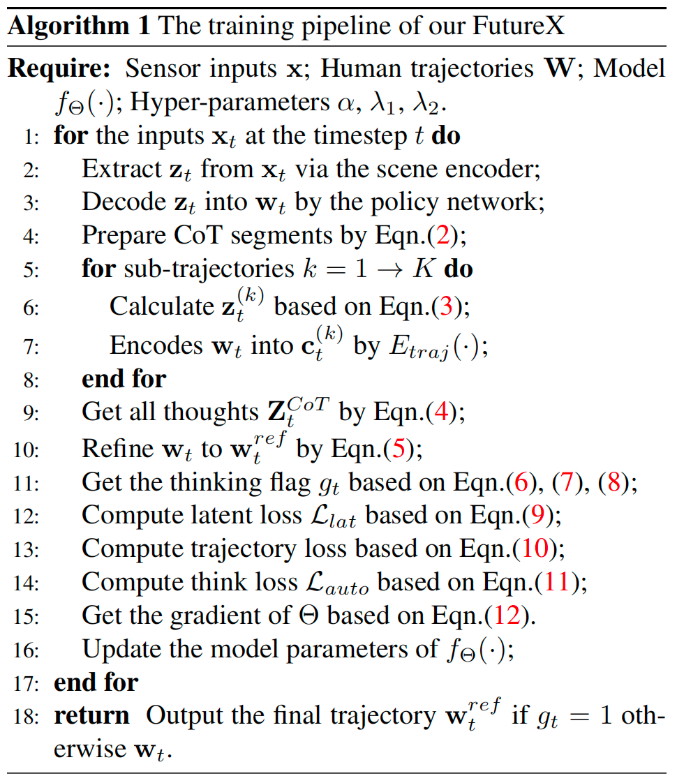 为实现FutureX的端到端训练,我们同时对外部轨迹预测和内部推理过程进行监督。具体定义三个损失项:1)轨迹规划损失,使优化后的轨迹与人类专家轨迹对齐;2)潜在一致性损失,监督思维链潜在世界模型;3)开关监督损失,指导自动思考开关何时调用潜在推理。
