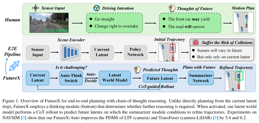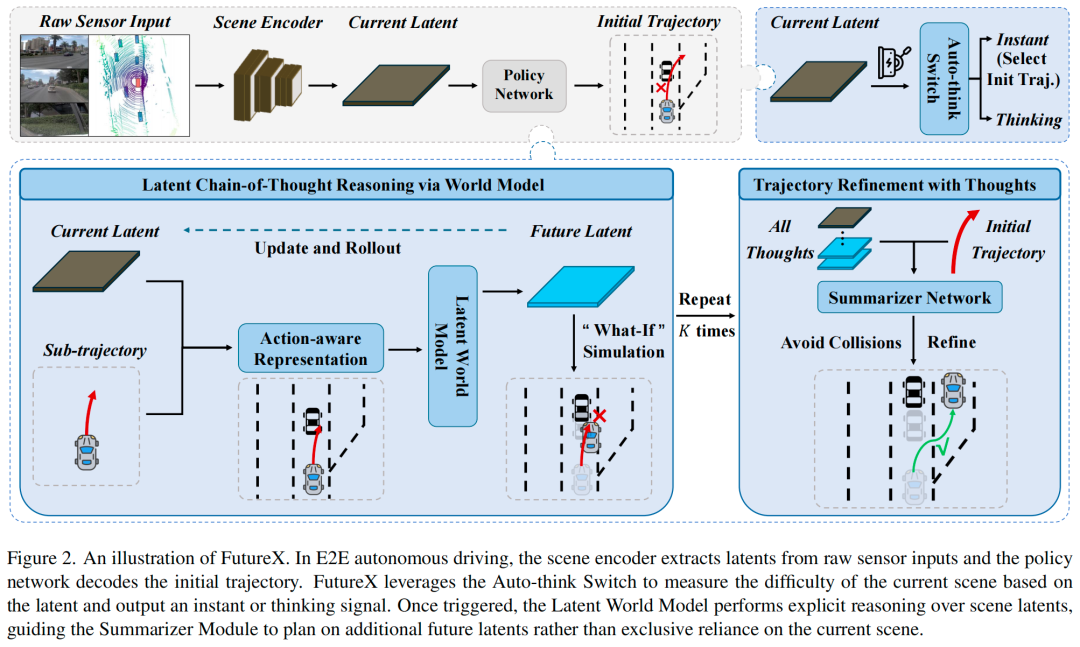 本文提出一种将思维链推理融入潜在世界模型的端到端驾驶框架FutureX。该方法通过执行迭代的“思考-模拟-行动”循环,在执行动作前对假设未来场景进行推理。具体而言,潜在世界模型基于丰富的场景表征进行潜在思维链推理,捕捉环境动态;随后,FutureX执行推理总结步骤——类似大型语言模型将中间思考整合为最终答案的过程,生成最终的思维链感知规划。为满足实际部署需求,自动思考开关决定是否激活潜在世界模型,实现性能与时间开销的平衡。在NAVSIM和CARLA数据集上的实验表明,FutureX在增强纯视觉和多模态端到端自动驾驶系统的性能方面具有有效性和适用性。
