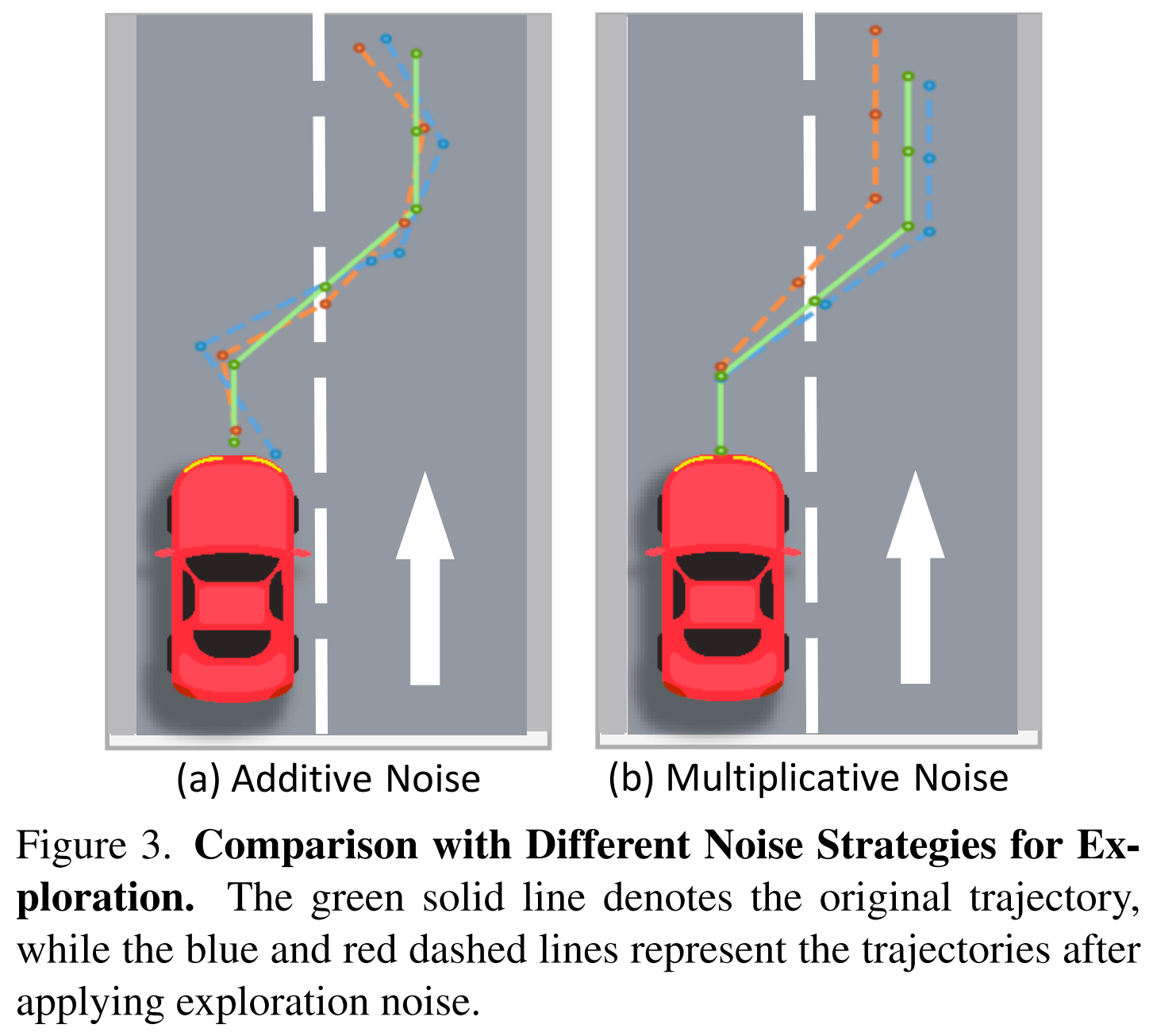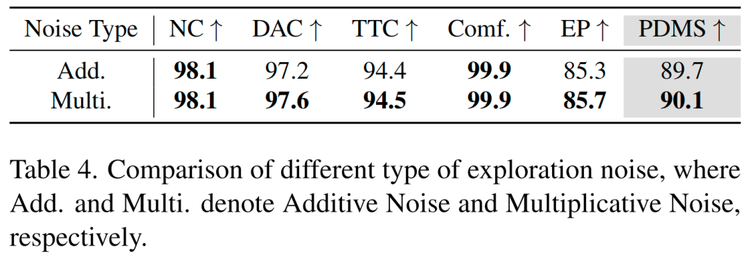 探索噪声类型:表4展示了不同探索噪声的对比结果。实验证实,尺度自适应乘法噪声优于加法噪声,能有效解决轨迹近端与远端的尺度不一致问题。
