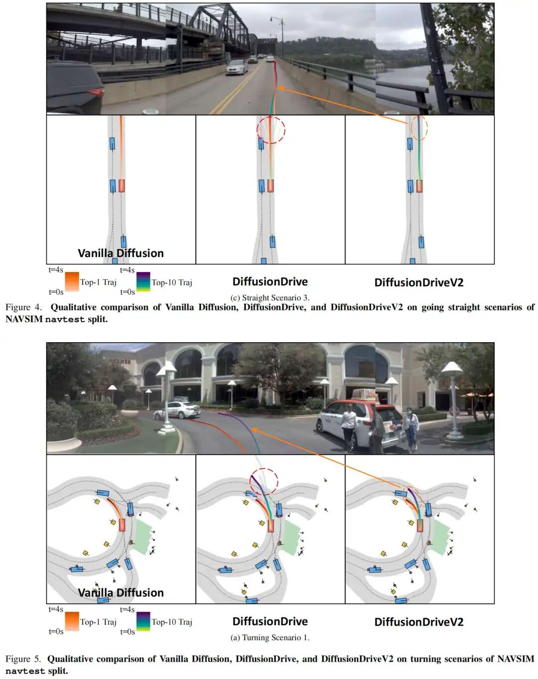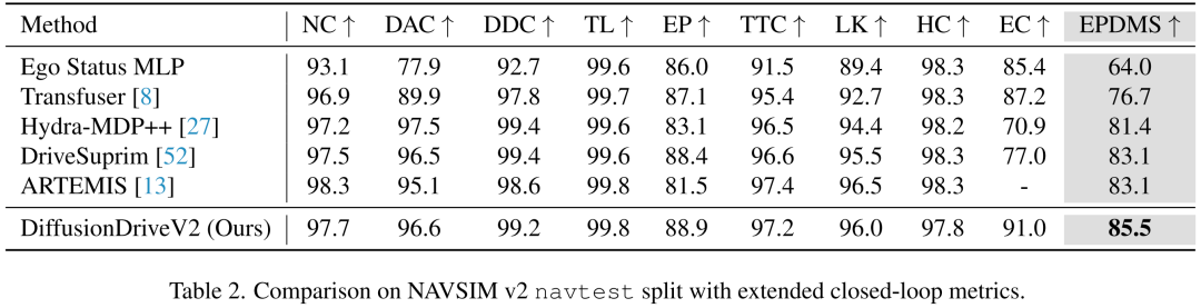 在NAVSIM v1和NAVSIM v2基准测试中的大量评估表明,DiffusionDriveV2在保留底层高斯混合模型生成多模态轨迹能力的同时,显著提升了整体输出质量,实现了当前最优性能。