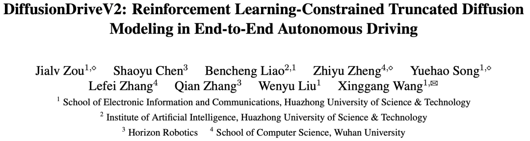 论文标题:DiffusionDriveV2: Reinforcement Learning-Constrained Truncated Diffusion Modeling in End-to-End Autonomous Driving