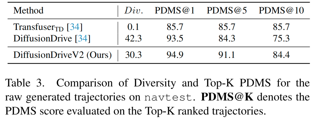 最终多样性得分为所有路径点 的平均值。为评估生成轨迹的整体质量,我们进一步报告Top-K PDMS(前K个排名轨迹的PDMS分数)。由于基于回归和基于选择的端到端自动驾驶方法仅能生成确定性轨迹,我们仅在测试集中将本文方法与其他基于扩散的方法进行对比。参考DiffusionDrive的设置,每个模型生成20条轨迹用于评估,结果如表3所示。