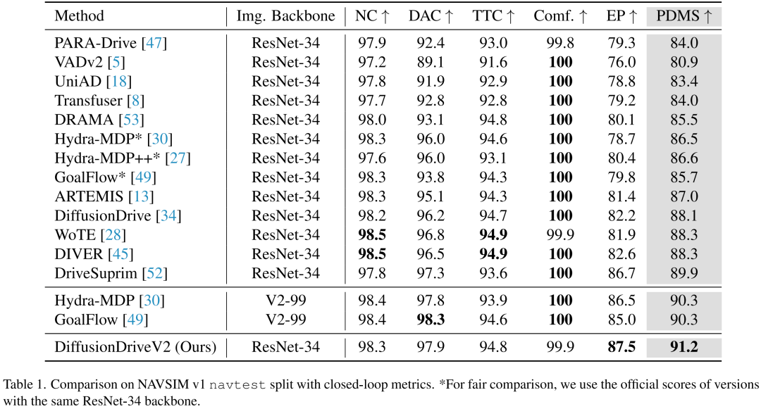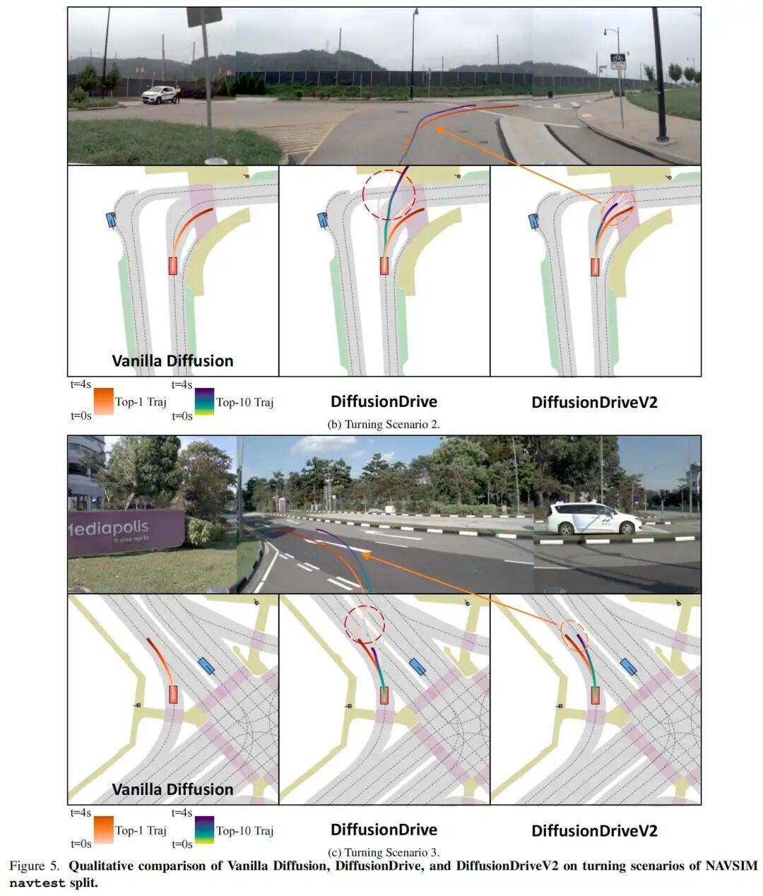 借助这些创新,本文提出一种新型框架DiffusionDriveV2,利用强化学习解决DiffusionDrive因依赖模仿学习而面临的多样性与持续高质量之间的两难问题。我们在面向规划的NAVSIM v1和NAVSIM v2数据集上通过闭环评估对该方法进行基准测试。DiffusionDriveV2在两个基准测试中均达到当前最优水平:结合ResNet-34主干网络,在NAVSIM v1上实现91.2的PDMS,在NAVSIM v2上实现85.5的EPDMS,相比现有方法有显著提升。此外,与其他基于扩散的生成模型相比,DiffusionDriveV2在轨迹多样性与持续高质量之间实现了最优权衡。