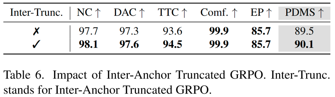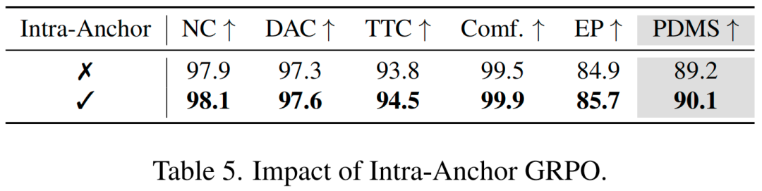 受DeepSeek-R1成功的启发,已有多项研究将GRPO引入端到端自动驾驶领域,但这些应用仅限于原始扩散模型。与这些方法不同,在基于锚点的截断扩散模型中,每个预定义轨迹锚点代表不同的驾驶意图。若直接对不同驾驶意图对应的轨迹进行优势估计,会加剧模式崩溃。例如,左转轨迹和直行轨迹应共存,而非进行优劣比较。这一见解促使我们提出锚点内GRPO:通过仅在每个锚点内进行组优势估计,阻止不同意图间的比较,从而防止模式崩溃;同时引入锚点间截断GRPO,以提供全局视角并稳定训练。