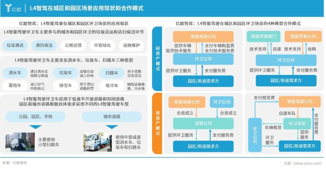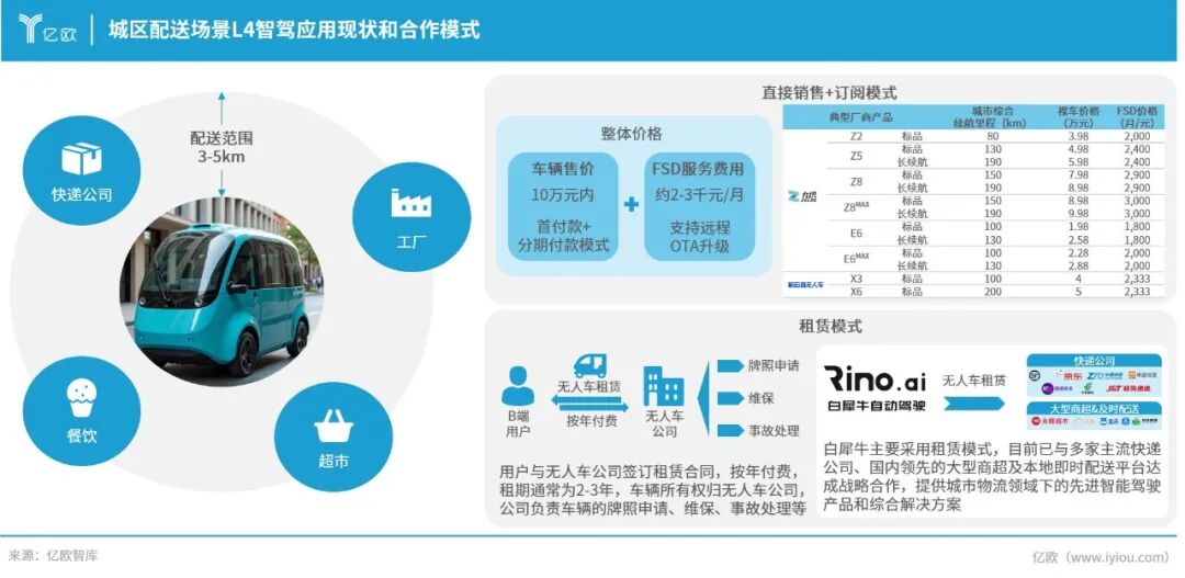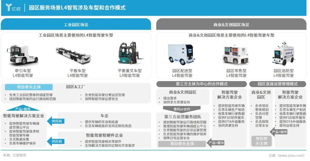 工业园区多采用牵引车、叉车等车型,由智驾企业提供产品与技术支持;商业园区则更多使用小型车辆进行零售配送或巡防,运营方式包括园区自营和第三方代运营。
