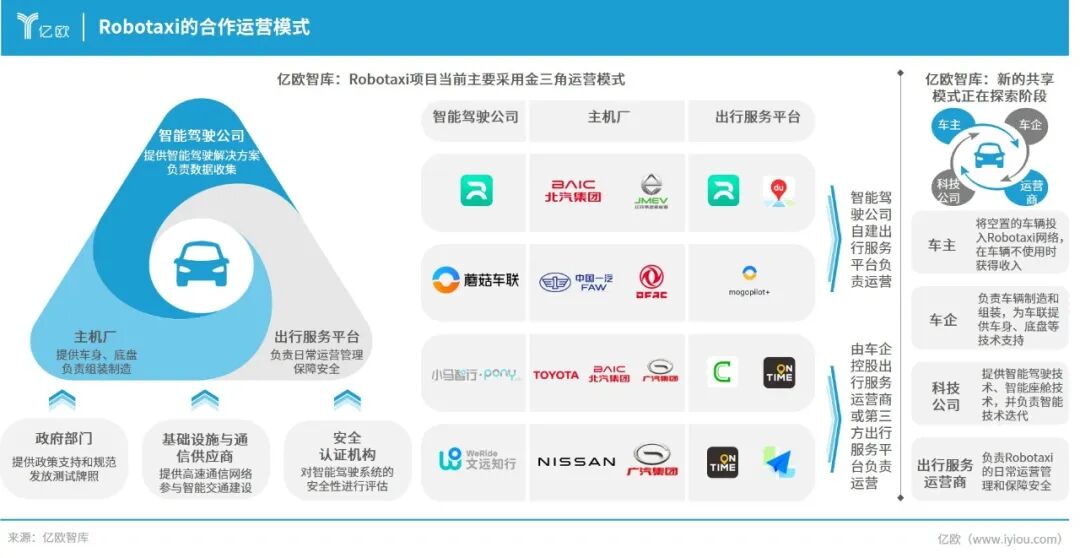 Robotaxi已形成以智驾公司、主机厂和出行平台为核心,政府、通信与安全机构辅助的成熟“金三角”模式,特斯拉等企业还在探索包括车主在内的四方协作模式。