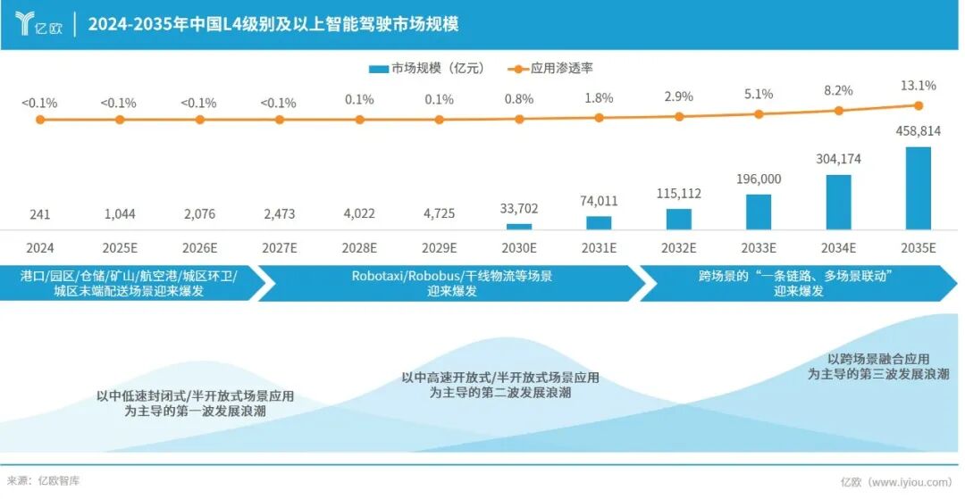 商业上正从单点工具发展为跨场景运力平台,融入共享经济与多业态联动,逐步从低速封闭场景向中高速开放场景推进,预计2035年中国L4及以上智驾市场规模将超过45万亿元,渗透率达13%以上。