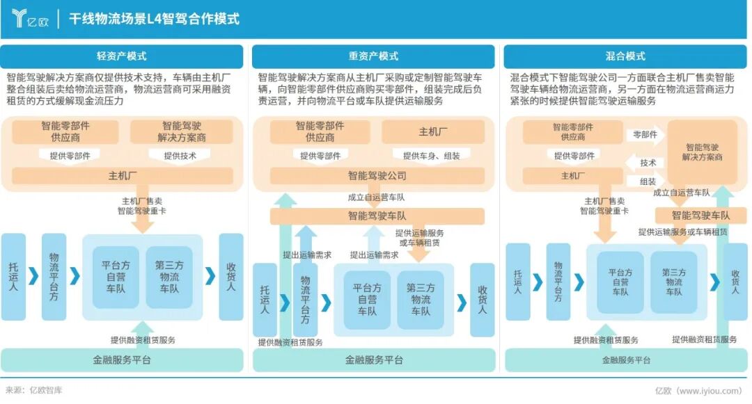 干线物流存在轻资产、重资产和混合三类合作模式,目前以L2辅助驾驶为主,正逐步向高阶智驾发展。