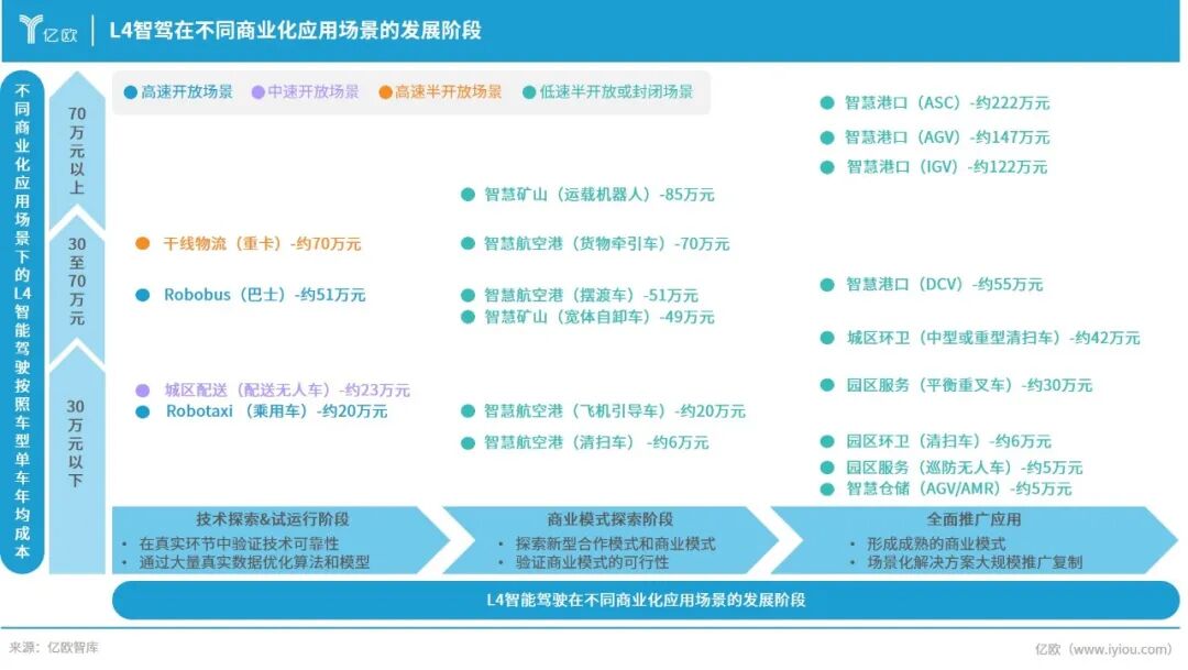 低速半开放和封闭场景L4智驾基本已进入商业模式探索阶段和全面推广应用阶段,中高速开放/半开放场景当前多处于早期阶段。