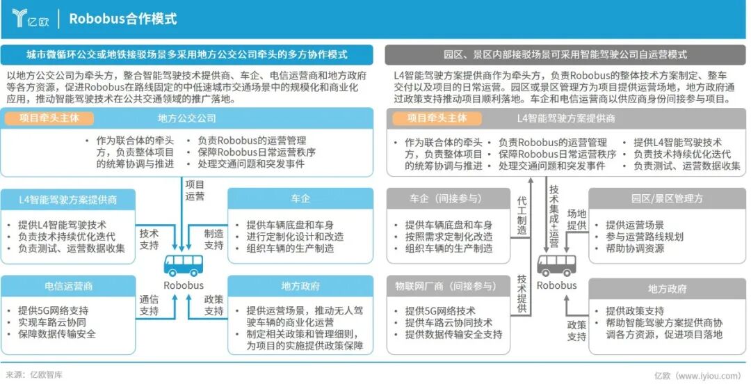 Robobus应用于城市微循环、地铁接驳及园区景区内部线路,城市公交多采用公交公司主导、多方协同的运营机制,园区景区则常见技术方直接参与运营。