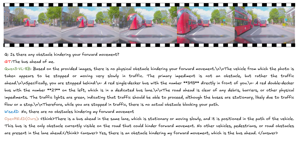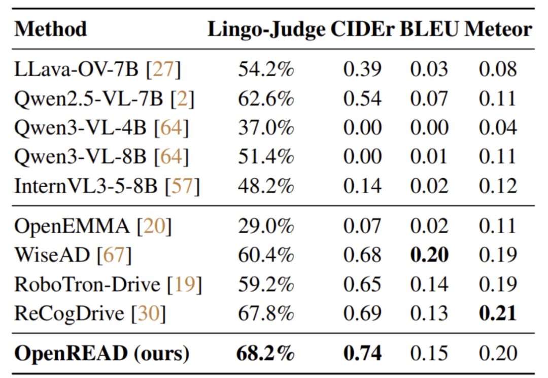 OpenREAD与Owen3-VL和WiseAD在LingoQA上的对比。