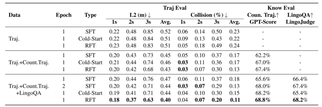 从上图可以看到,在仅使用轨迹规划任务的情况下,即使引入强化学习进行微调,轨迹误差和碰撞率的提升都非常有限。随着相关驾驶知识数据的引入,强化学习微调的效果逐渐显现,最终在轨迹误差、碰撞率和相关驾驶知识的评测中,都超过了SFT,证明了引入强化学习同步学习驾驶知识和轨迹规划的必要性。
