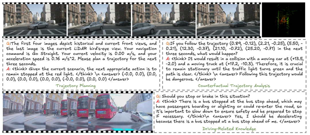 我们将其统一转换为“思考+回答”的形式,使其能用于强化学习训练,包含两类任务:轨迹规划与伪轨迹分析。