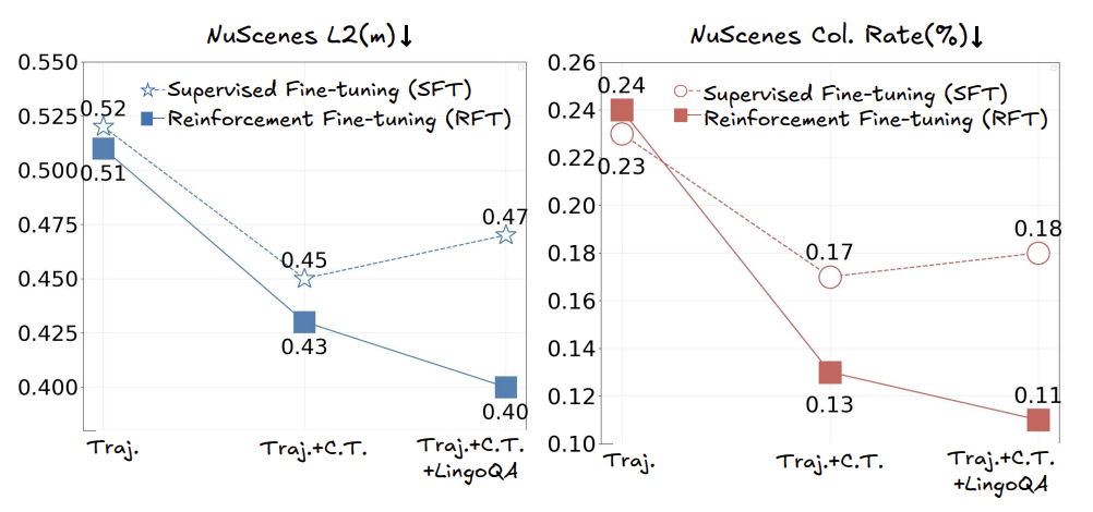 为了验证强化学习对知识学习和轨迹规划协同微调带来的提升,我们分别在LingoQA和NuScenes数据集上对OpenREAD进行评测。
